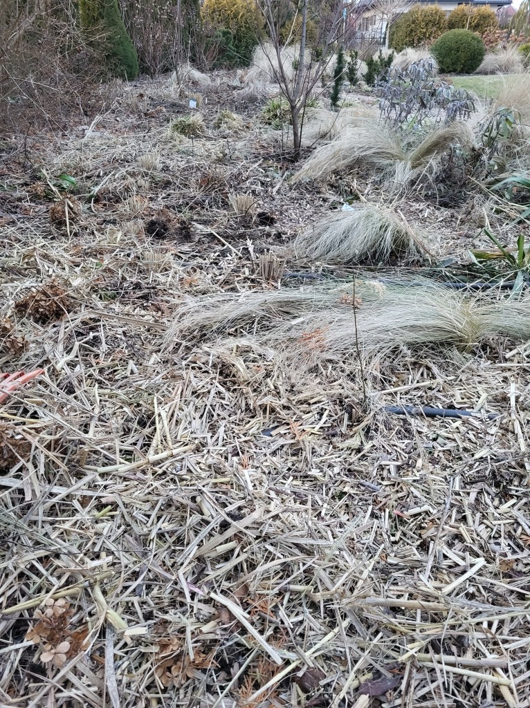 Przed założeniem trawników przywieźliśmy na działkę czarnoziem. I choć dziś nie jestem fanem przywożenia do siebie jakichkolwiek obcych ziem, wtedy byłam szczęśliwa. Jeśli mam być szczera, niewiele to dało. Rozpoczęło jedynie proces poprawy struktury wierzchniej warstwy gleby. W pierwszych latach stosowałam głęboką na wysokość szpadla uprawę gliny. Szczególnie tej w ogrodzie warzywnym. Gdy zaczęłam stosować ściółkowanie rabat ozdobnych materią organiczną, poprawiłam zdecydowanie zasobność gleby a przede wszystkim rozluźniłam jej strukturę. Kompost, zrębki, skoszona trawa powoli zaczęły wypierać ozdobne ściółki z kory i nieszczęsnego grysu.